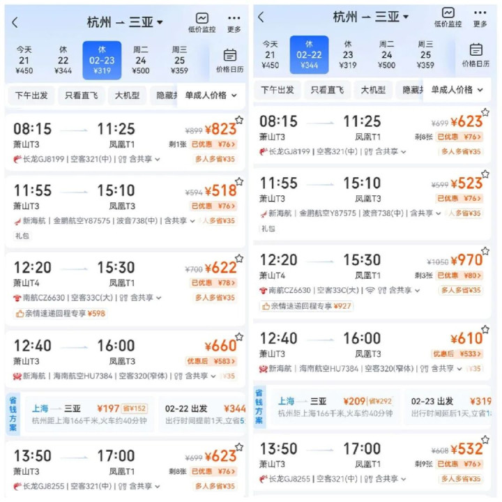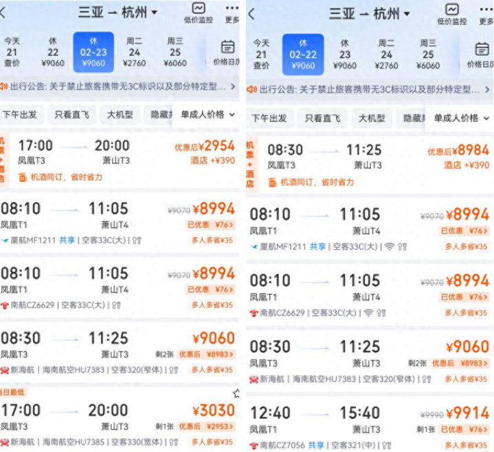 这不,最近又有好几家媒体关注三亚返程机票的价格新闻。比如有报道说,2月23号,也就是初七,春节假期最后一天,三亚直飞杭州的经济舱票早就卖光了,剩下最便宜的机票都得八九千,这还是稍稍打了个折的公务舱。你要是买张全价的公务舱,那不好意思,小一万块钱就这么飞走了。“三亚返程机票逼近万元”这话题,又不知不觉地上了热搜。