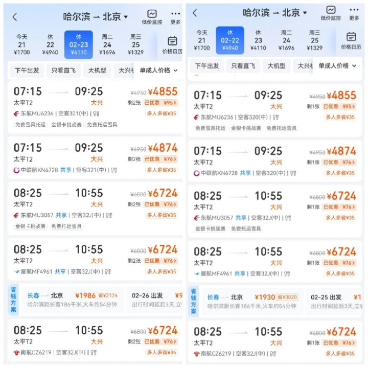 这就是供需的不平衡,而且这种现象也并非三亚所独有。不然您去看,春节假期的热门目的地城市,到了返程是不是都有类似的情况出现。比如,冬季冰雪游火热的哈尔滨,我刚看了一下接下来两天的机票价格,哈尔滨飞北京,距离并不算太远,机票也已经五六千甚至六七千的价格了,这比平时也已经贵出去太多太多了。